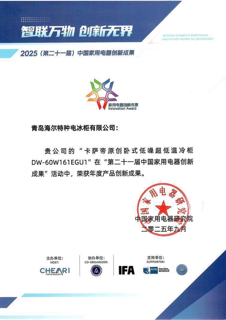 9月5日,柏林国际电子消费品展览会(IFA2025)正式开幕。同期,由中国家用电器研究院主办的第二十一届中国家用电器创新成果推介活动在德国柏林顺利召开。卡萨帝原创卧式低噪超低温冷柜凭借其突破性创新,荣获“年度产品创新成果”奖,成为行业唯一获此殊荣的-60℃超低温存储产品。