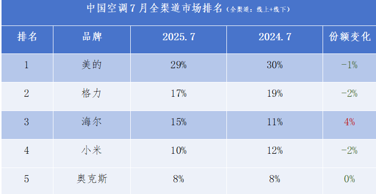奥维云网最新发布的2025年7月全渠道(线上+线下)空调销量数据,清晰展现了头部品牌的份额变动。其中,美的以29%的份额位居榜首,较2024年同期微降1个百分点;格力以17%的份额位列第二,同比下滑2个百分点;海尔以15%的份额占据第三,同比提升4个百分点。在市场前三甲中,海尔成为唯一实现份额同比正增长的品牌。